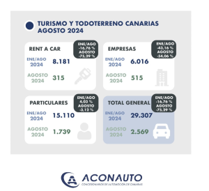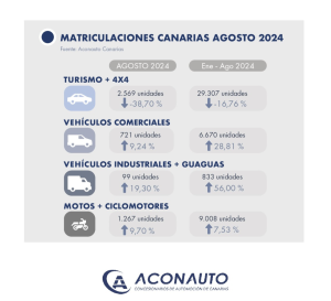 · El mercado de turismos y todoterrenos cae un 38,7% en Canarias, el pasado mes de agosto con 2.569 matriculaciones. El sector acumula una caída en lo que llevamos de año del 17%. El mercado peninsular, cae un 6,41% durante el mismo periodo.