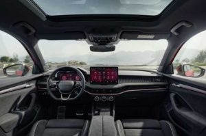 El techo interior es siempre de color negro. Los listones decorativos del salpicadero y de los guarnecidos de las puertas tienen un acabado con efecto carbono. Los cubrepedales de acero inoxidable aportan otro toque deportivo y dinámico. El Superb Sportline viene con un volante deportivo multifunción de tres radios con costuras negras e insignia Sportline. Al igual que los demás modelos de la serie, el Superb Sportline complementa el Virtual Cockpit de 10 pulgadas con gráficos específicos Sportline, con una pantalla de infoentretenimiento independiente de 10 pulgadas de serie. La iluminación ambiental también es de serie en los Design Selections disponibles para elegir.