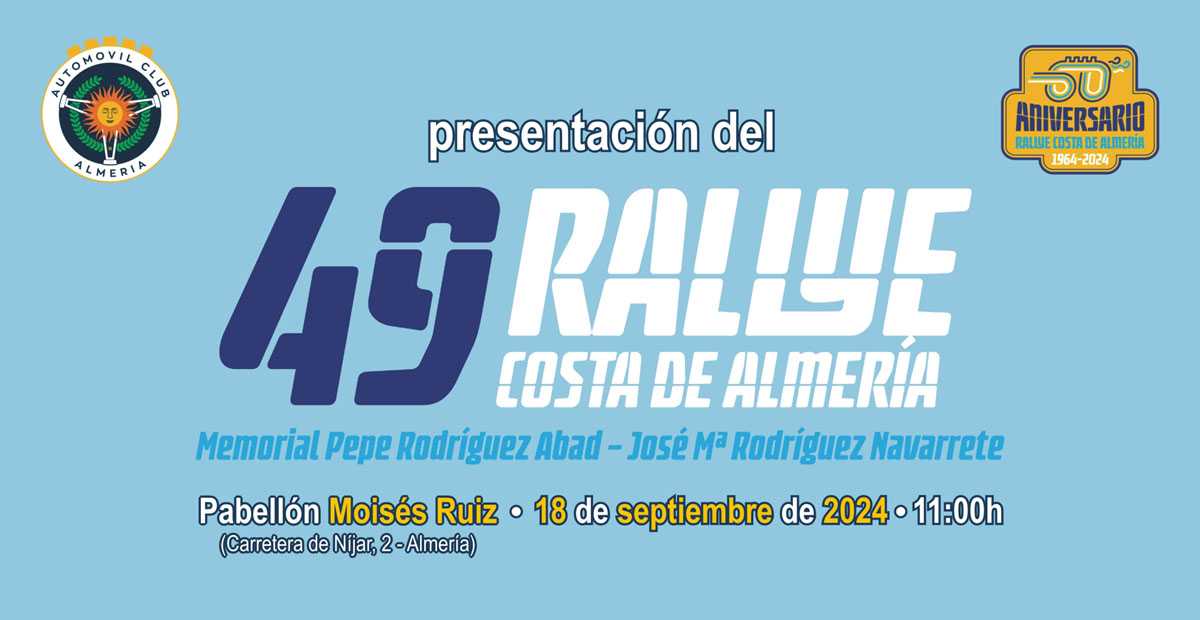 El 49 rallye Costa de Almería será presentado oficialmente este miércoles, día 18 de septiembre. El acto se celebrará a partir de las 11 de la mañana en el Pabellón Moisés Ruiz de Almería.