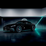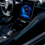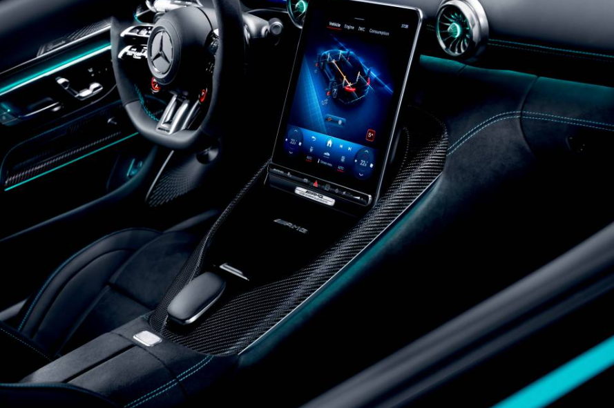 El interior también se caracteriza por numerosos detalles en color PETRONAS. Los asientos AMG Performance de serie están tapizados en cuero napa negro/Microfibra MICROCUT con pespuntes en color PETRONAS y escudos AMG en relieve en los reposacabezas. Las inserciones AMG de carbono combinan con el volante calefactado AMG Performance de cuero MICROCUT/microfibra con pespuntes en color PETRONAS. Este pespunte también se encuentra en los guarnecidos de las puertas, el cuadro de instrumentos y la consola central. Los embellecedores AMG de los umbrales de las puertas están revestidos de negro e iluminados en color PETRONAS.