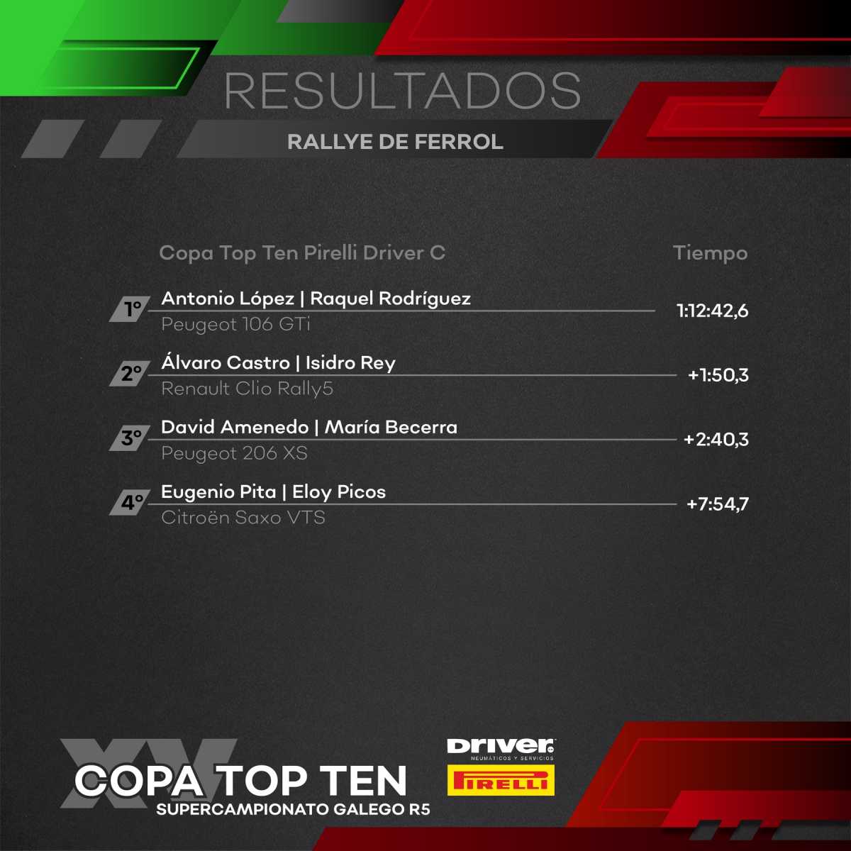 EncuantoalaCopaTopTenPirelli»C»,muchoscandidatosapostabanalavictoriaestepasado fin de semana en la Ribeira Sacra. Desde un inicio Guillermo Martínez, con su Ford Fiesta R2T se mostró muy cómodo, marcando la referencia en Castro de Beiro. Sólo Álvaro Castro pudo seguir su ritmo desde los primeros compases del sábado, al tiempo que lideraba entre los Clio. Por detrás, Daniel Montoto y Gabriel Gándara se disputaban el último cajón del podio, con Cristian Lamas ó Marco Lorenzo tras ellos.