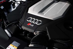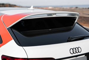 Además, el diseño exterior de esta unidad se completa con vinilos exclusivos en los colores tradicionales de Audi Sport, negro, gris y rojo, que contrastan con el acabado Blanco Arkona. Estos detalles se complementan con llantas de alto brillo en blanco, creando una combinación visual única y potente.