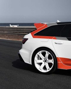 En el perfil lateral, destacan las llantas de 22 pulgadas en acabado blanco brillante y con diseño de seis radios, junto con las cubiertas de los retrovisores en carbono brillante y las inserciones en los faldones laterales. En esta edición especial, las barras del techo han sido eliminadas para crear una silueta más baja y deportiva. La parte trasera no pasa desapercibida, con la insignia «RS 6 GT» en negro y un portón trasero que ha sido modificado para ofrecer un borde de carga visualmente más bajo. El difusor funcional, con un reflector centrado verticalmente, aumenta la sensación de anchura, mientras que el alerón doble inspirado en el automovilismo acentúa su carácter de alto rendimiento.