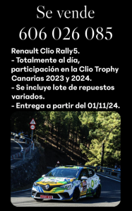 Su intención es la de correr con su unidad la cita de casa, el Rally de Maspalomas, donde estará luchando por intentar conseguir el título de la Clio Trophy Canarias, y será tras la celebración de esta prueba del Campeonato Provincial de Las Palmas, a partir del 1 de noviembre, cuando los interesados podrán tenerla en propiedad.