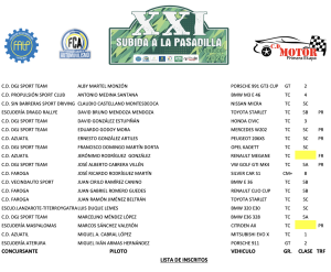 Lista de inscritos de la 21ª Subida a La Pasadilla Por Rafa León Última actualización: 02/10/2024 19:13 Compartir FacebookTwitterWhatsAppEmailTelegramLinkedin Publicamos la lista de inscritos de la 21ª Subida a La Pasadilla, prueba que se disputará este sábado, 5 de Octubre, en la isla de Gran Canaria, siendo organizada por el C.D. Motor Primera Etapa. Puedes unirte al canal de Telegram de automovilismocanario.com https://t.me/+hz3gTvEdIeZhNjhk Campeonato de Las PalmasCanariasEspañaEuropaGran CanariaLa PasadillaLas PalmasSubida a La Pasadilla Compartir