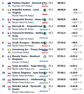 Después de conseguir su gran podio en el ERC en la última prueba en Gales, Mabellini llegó a la parada de asistencia del mediodía en el estadio de Silesia a 1,0 segundos de Paddon gracias a una excelente actuación del equipo MRF Tyres. Aunque el italiano retrocedió durante la tarde con su Škoda Fabia RS Rally2, se mantiene firme en el camino hacia su segundo puesto consecutivo, con su compañero de equipo, Simone Tempestini a 18,7 segundos en tercer lugar.