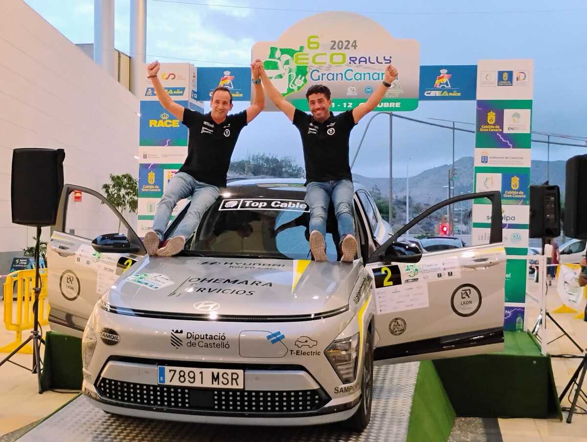 Pérez Aicart y Herrera, piloto y copiloto, inscriben así su nombre como ganadores del VI Eco Rally Gran Canaria. El dúo de pilotos a los mandos del Nuevo Hyundai KONA Eléctrico ha firmado un pleno en la prueba organizada por la escudería Club Deportivo Azuatil que les proclama, de forma virtual, como campeones del Campeonato de España de Energías Alternativas en la categoría reina, la de vehículos 100% eléctricos.