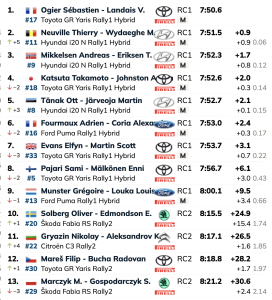 Elfyn Evans, Sami Pajari y Grégoire Munster ocuparon las tres posiciones siguientes mientras Oliver Solberg completaba el top 10. El sueco está compitiendo por los honores absolutos del Rally2 en su Škoda Fabia RS habiendo iniciado ya el máximo de siete pruebas puntuables del WRC2.