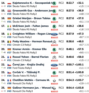 Hubo drama para Yohan Rossel, uno de los principales rivales de Solberg por el título de WRC2 de este año. El francés debe ganar este rallye para seguir en la lucha por la corona, pero llegó a la meta del TC2 con una rueda trasera derecha rota en su Citroën C3 Rally2, cediendo alrededor de medio minuto. El compañero de equipo de Rossel, Nikolay Gryazin, lideraba por tanto la categoría por delante de Filip Mareš.