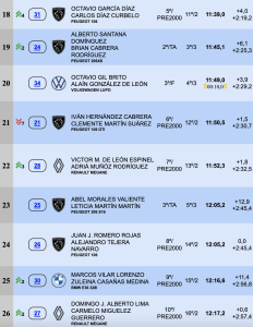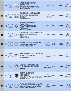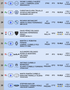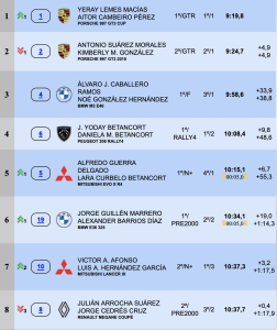 El tercer puesto en el podio provisional nocturno es para el BMW M3 de Alvaro Caballero-Noé González, pero ya a 38,8 de la cabeza de la clasificación, con Yoday y Daniela Betancort muy cerca a 9,8 segundos en el cuarto puesto de la general con el Peugeot 208 Rally4. El quinto lugar lo ocupan después de los dos primeros TC, el Mitsubishi Lancer Evo X de Alfredo Guerra-Lara Curbelo.
