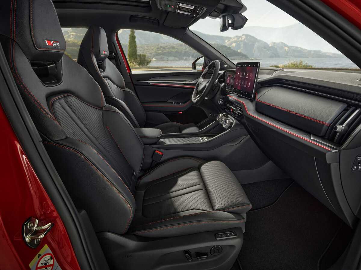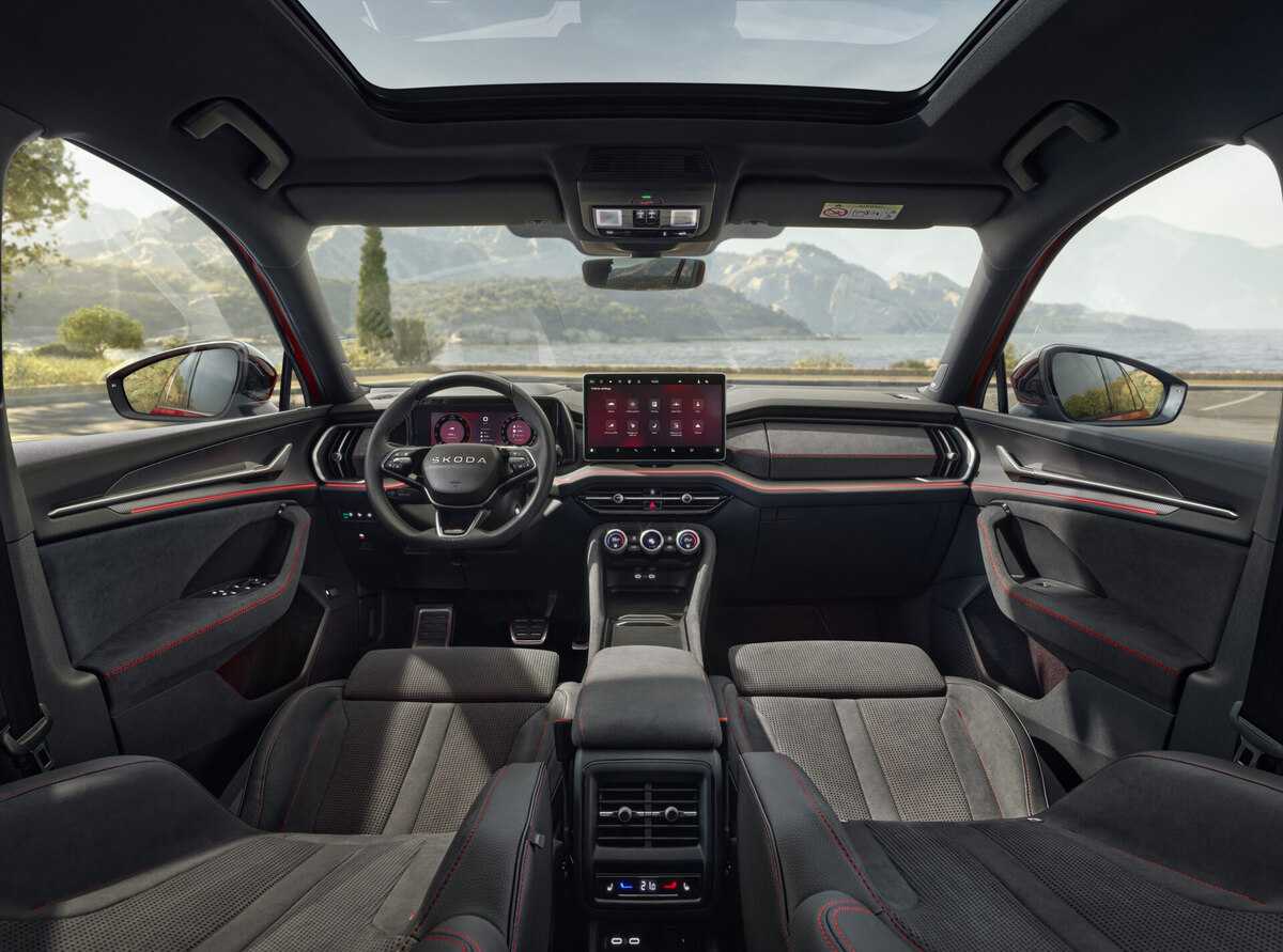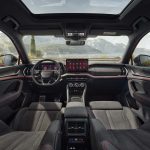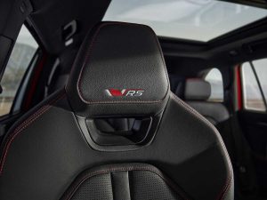 La parte de diseño del salpicadero, las inserciones de las puertas y el reposabrazos central están revestidos de Suedia negro. El equipamiento opcional RS de la Design Selection Suite incluye asientos deportivos, calefactados y ventilados con reposacabezas integrados y cuero sintético/cuero perforado negro con costuras de contraste rojas. La parte de diseño del salpicadero, las inserciones de las puertas y el reposabrazos central están revestidos de cuero artificial negro. El Kodiaq RS viene con un volante deportivo multifunción de 3 radios con costuras rojas y un distintivo RS. Los embellecedores de los pedales de acero inoxidable se incluyen de serie y los umbrales de las puertas delanteras llevan la inscripción «Kodiaq». El cristal laminado de las ventanillas laterales acústicas delanteras y traseras mejora el confort en el interior del coche gracias a un aislamiento acústico aún mejor. Como el resto de modelos Kodiaq, el Kodiaq RS complementa su Virtual Cockpit de 10 pulgadas con una pantalla de infoentretenimiento independiente de 13 pulgadas, como parte del paquete Technology 13’’ que, en Canarias, viene de serie en el modelo.