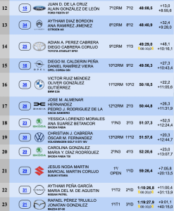 A pesar de sufrir una penalización de 40 segundos, Daniel Guerra y Gabriel Espino llevaron el Subaru Impreza a la tercera posición, superando en 49.0 a Iriome Perdomo y Francisco del Pino Cabrera( Subaru Impreza GC8), cuartos.