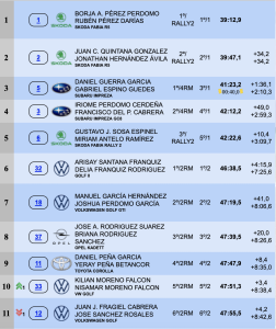 A pesar de sufrir una penalización de 40 segundos, Daniel Guerra y Gabriel Espino llevaron el Subaru Impreza a la tercera posición, superando en 49.0 a Iriome Perdomo y Francisco del Pino Cabrera( Subaru Impreza GC8), cuartos.
