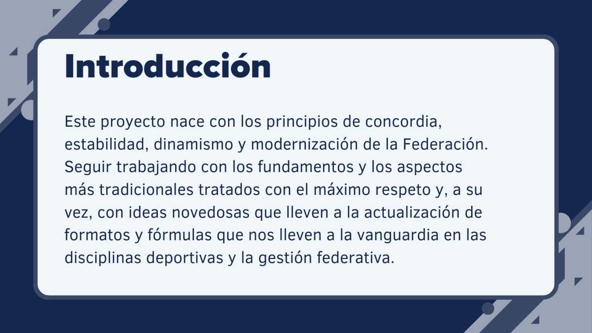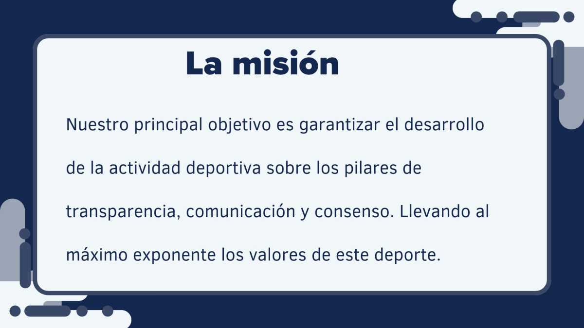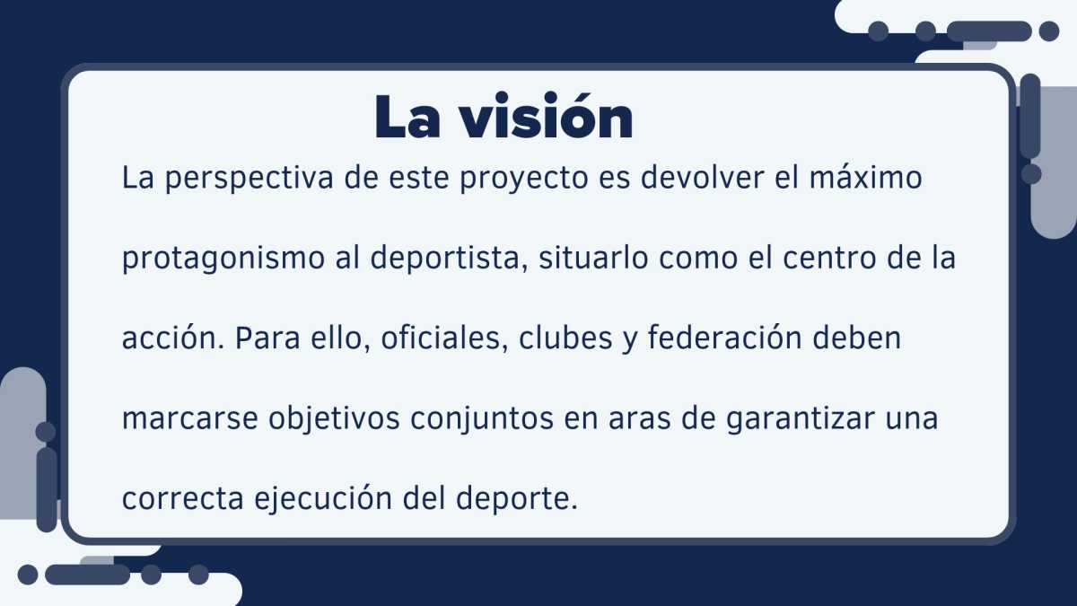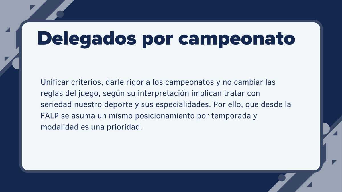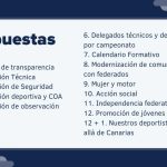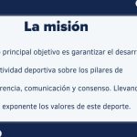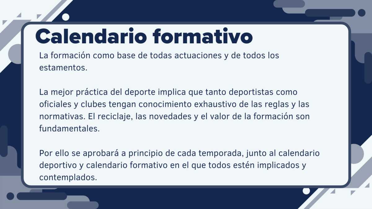 Y, con el mismo objetivo, fomentar la figura de delegados por campeonato de tal manera que el criterio sea el mismo durante toda la temporada y la aplicación reglamentaria, por ende, la misma». Asimismo, «poner en marcha un calendario formativo que suponga dotar a nuestros oficiales, deportistas y clubs de conocimientos para una mejor práctica del deporte. La formación como eje transversal de toda acción federativa».