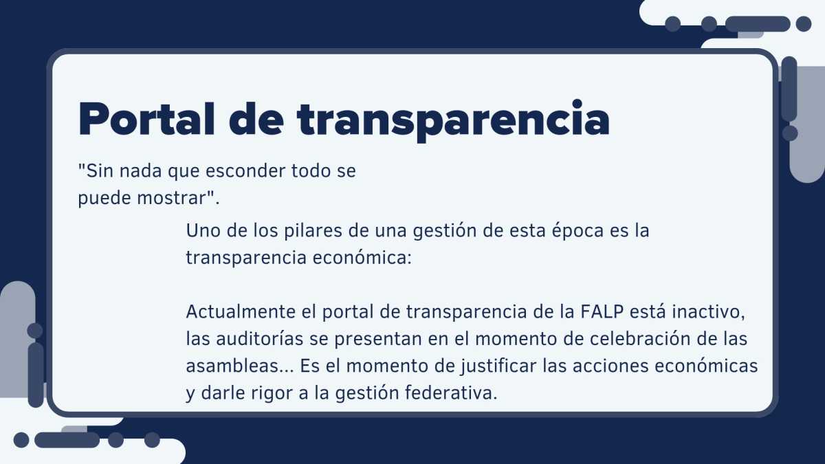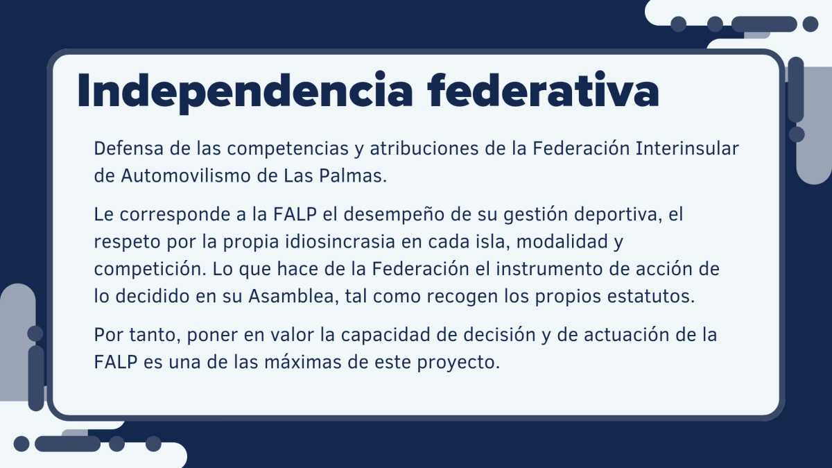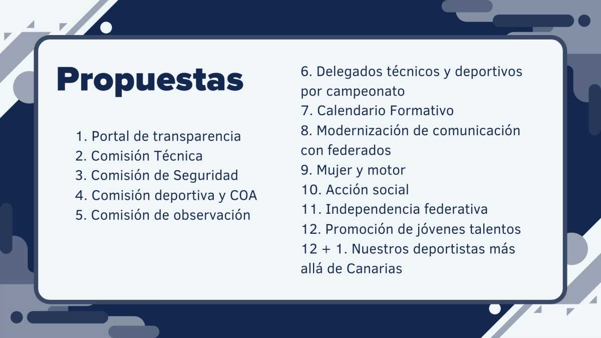 El proyecto, con 12 + 1 líneas claras de trabajo, hace especial hincapié en la transparencia, asunto en el que la Federación de Automovilismo de Las Palmas (FALP) siempre ha ido a remolque y en contra de cualquier código de gestión y buen gobierno de las instituciones en esta época. Además de la independencia del COA, la unificación de criterios y la independencia federativa de la FALP, entre otras muchas.