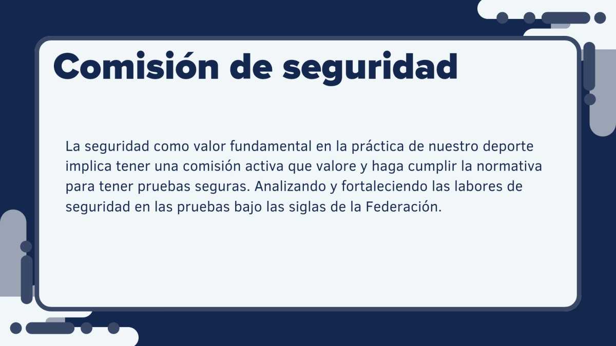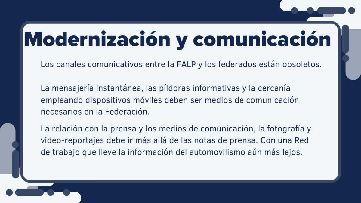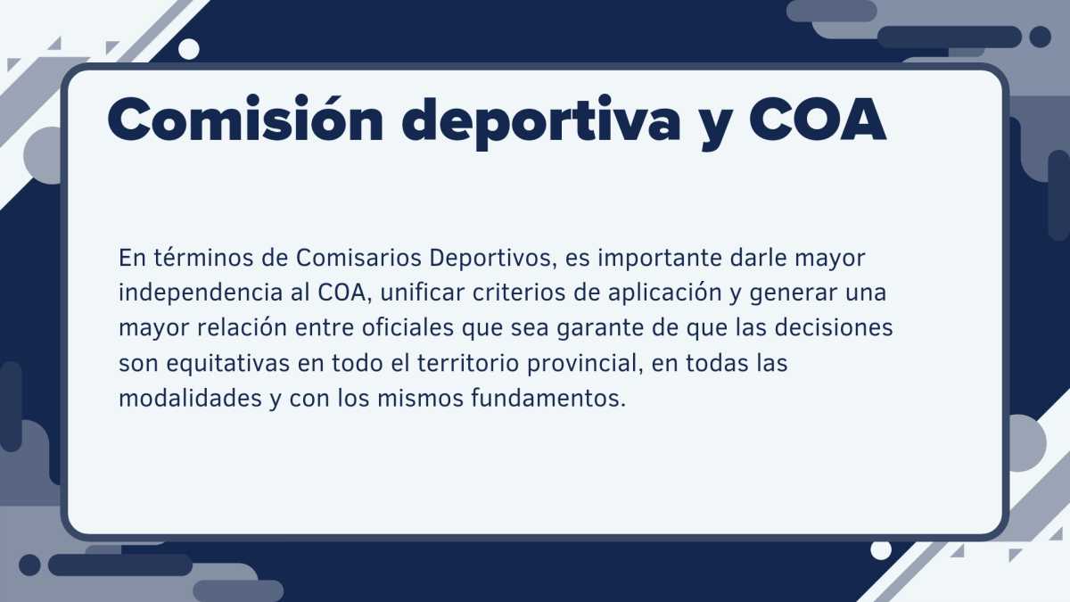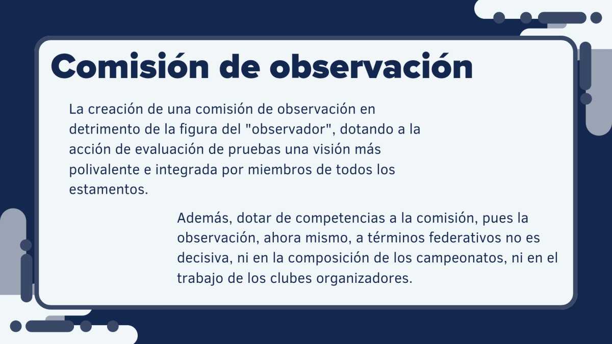 Trabajar en la creación de comisiones con capacidad de trabajo tales como la Comisión Técnica o la Comisión de Seguridad que en la actualidad, o bien, no existen, o bien, no operan con independencia. Así como la creación de una Comisión de Observación, en detrimento de la figura del observador que, además, no tiene efecto su trabajo en los campeonatos de la FALP». Por supuesto, «un COA más amplio, polivalente y diverso, donde se genere un foro de debate y análisis que suponga tomar las decisiones con más rigor y criterio.