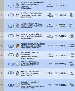 Cuarta plaza para los tinerfeños Manolo Mesa y Néstor Gómez en su debut con el Citroen C3 Rally2, sufriendo problemas mecánicos que les impedía rodar con normalidad. Se quedaban a 3:15,1 del liderato, a 2:33,1 del tercer puesto y superando en 1:23,5 a Alberto Monzón y Aday Suárez (Porsche 911 GT3), quintos.