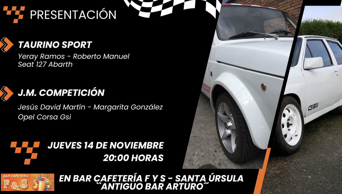 Los equipos tinerfeños de competición Taurino Sport y J.M. Competición presentan sus nuevos vehículos de competición en la tarde de hoy jueves, 14 de Noviembre, a partir de las 20:00 Horas en bar Cafetería F Y S, ‘Antiguo Bar Arturo’, ubicado en Santa Úrsula (Tenerife).
