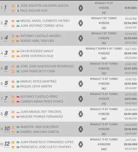 Lograron superar en 43.1 a los segundos clasificados, Miguel Ángel Clemente y Juan Antonio Torres, siendo terceros, a 44.1, Antonio Castillo y Sergio Abril, ambos con sendos Renault 5 GT Turbo.