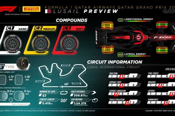 Estamos ante la tercera edición del Gran Premio de Qatar, tras los eventos celebrados en 2021 y 2023. El año pasado, el fin de semana se vio afectado por una decisión de la FIA, que impuso un máximo de 18 vueltas por juego de neumáticos durante la carrera, lo que obligó a todos los pilotos a realizar tres detenciones en boxes. La decisión del Director de Carrera se consideró necesaria tras una notificación de los ingenieros de Pirelli. Tras analizar los neumáticos devueltos por los equipos tras los dos primeros días de actividad en pista, se identificó la posibilidad de micro-laceraciones en los laterales, entre el compuesto de la banda de rodadura y los cordones de la carcasa. Estas laceraciones las causó el impacto repetido del paso sobre los pianos de algunas curvas.