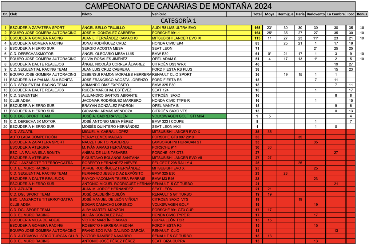 El podio de la Categoría 1 no se entendería esta temporada sin la también destacable actuación del José Manuel González Cabrera, que ha disputado cada carrera con el propósito de revalidar el título regional. Este 2024 se ha proclamado como Subcampeón de Canarias de Montaña con 164 puntos a los mandos de su Porsche 991 GT3.