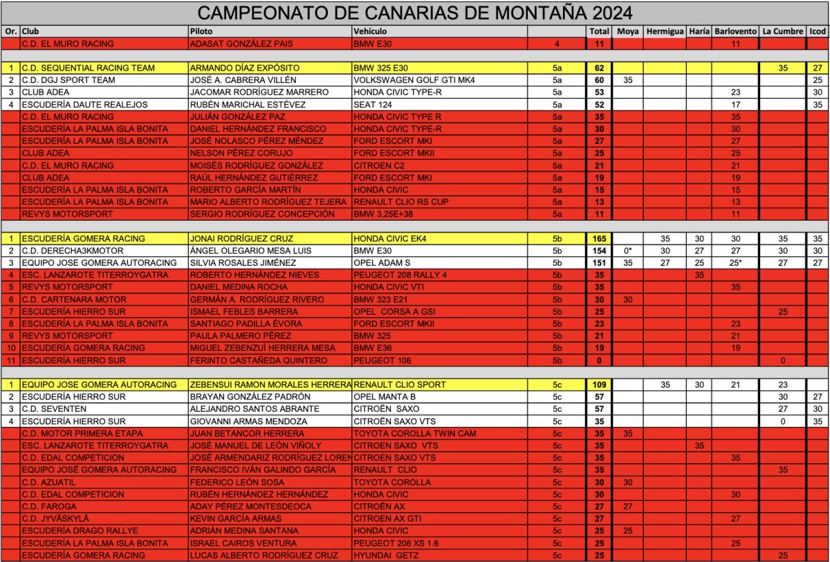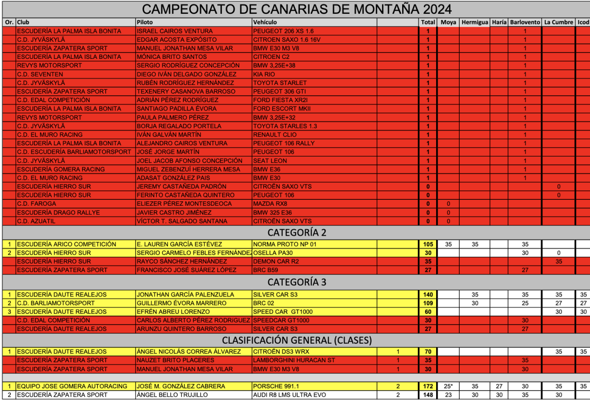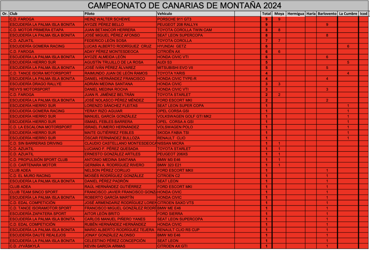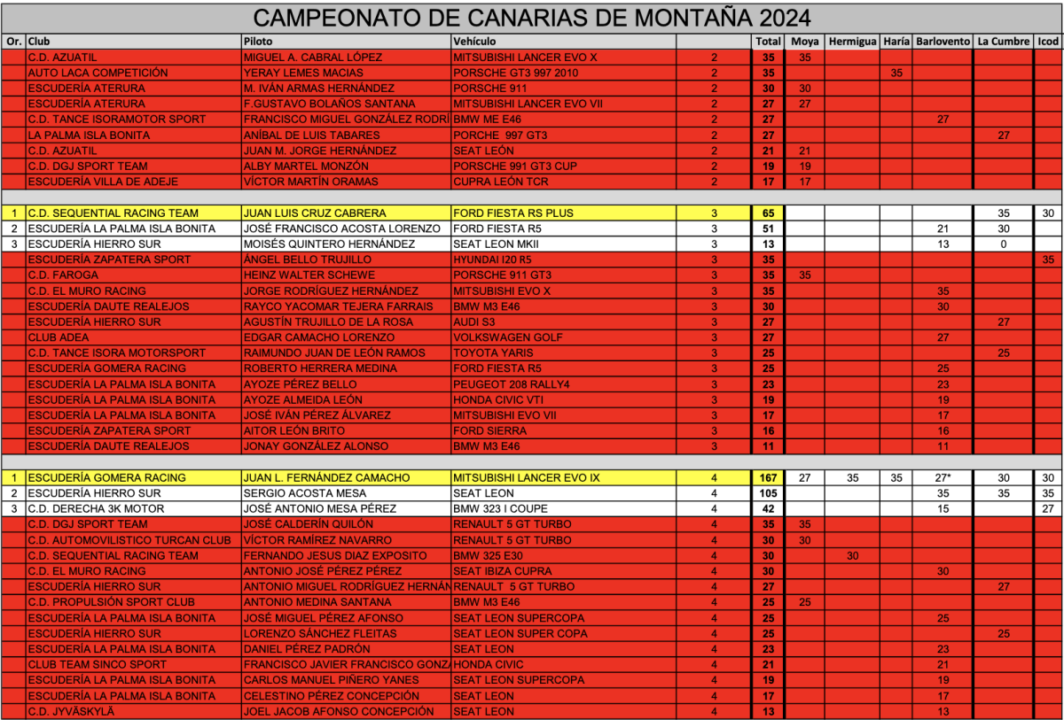 En la Categoría General de Clubes, con 250 puntos, el Equipo José Gomera AutoRacing se convierte en Campeón de Canarias de Montaña 2024.