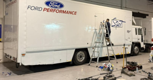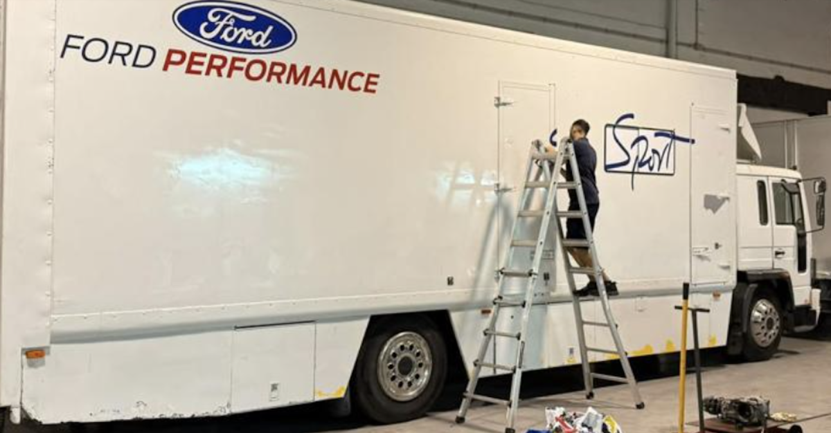 En la foto se observa como uno de los componentes de la estructura tinerfeña retira el vinilo que estaba en uno de los camiones de asistencia del equipo con base en San Cristóbal de La Laguna.