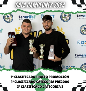 Los tinerfeños Kevin Kipar y Rubén Hernández, a los mandos del Peugeot 106 Rallye del Kipar Motorsport, recibieron en la Gala de Campeones de la Federación de Santa Cruz de Tenerife (FIASCT) el premio que les acredita como Campeones del Trofeo Promoción Tenerife 2024.