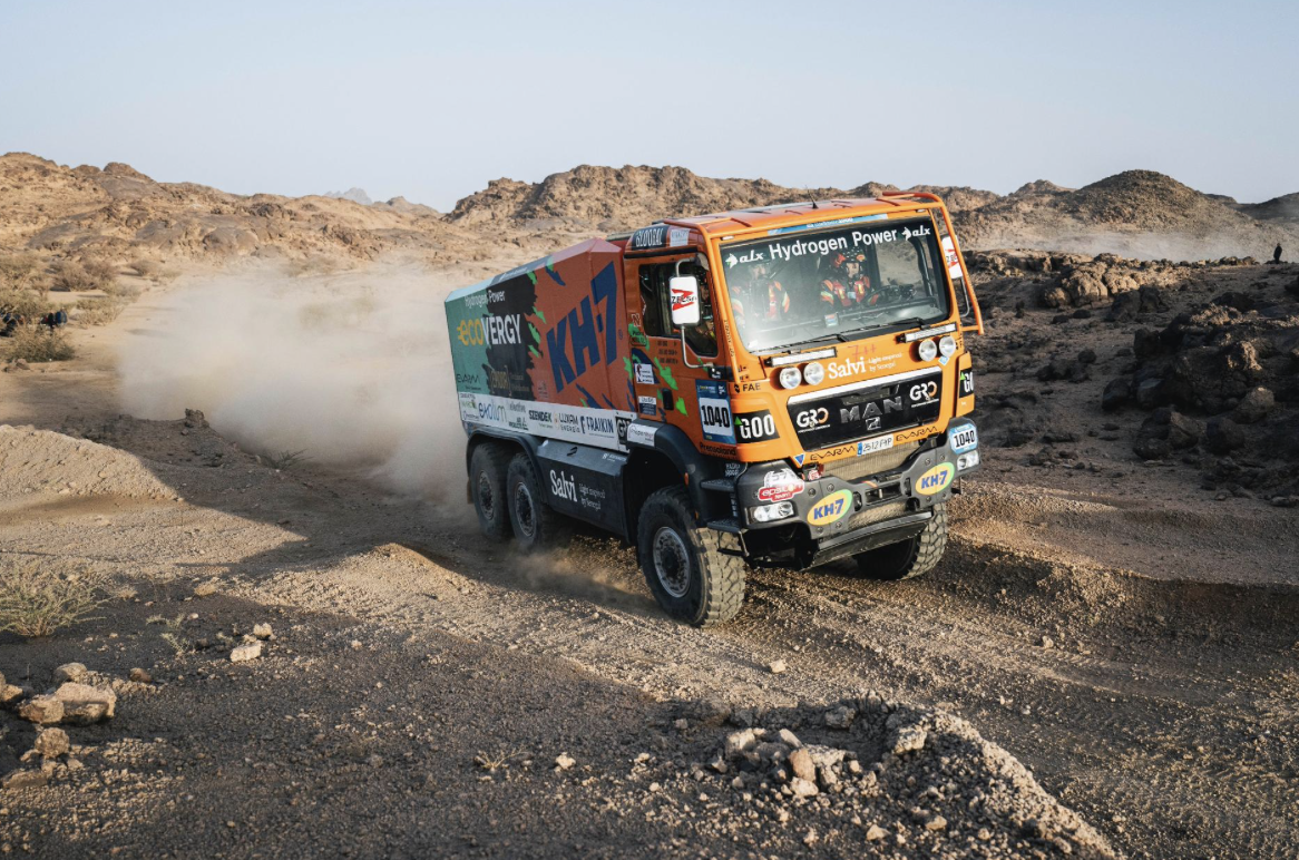 Criado se refiere a la tecnología mixta de Hidrógeno / HVO (aceite vegetal hidrotratado) que alimenta el motor del veterano MAN 6×6 naranja del equipo. Con este sistema, las emisiones contaminantes se reducen hasta en un 90%, con el mismo rendimiento del motor que si estuviera alimentado por gasoil. Al volante, el piloto Jordi Juvanteny no percibe diferencia alguna; al contrario, la respuesta del motor es incluso mejor. El sistema lo ha desarrollado la compañía española EVARM, cuyo director, Xavi Ribas, es el tercer tripulante en la cabina del camión de KH-7. El objetivo no es otro que demostrar la viabilidad de esta tecnología para la movilidad cotidiana.