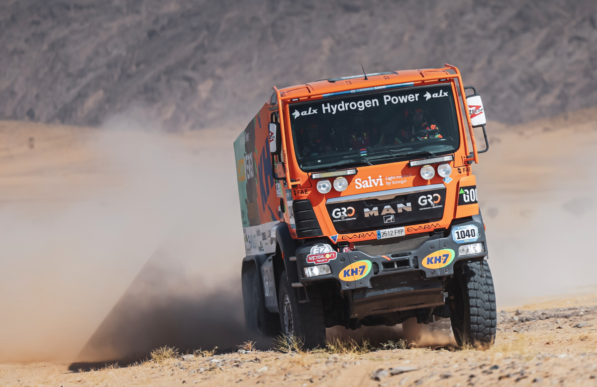 El Dakar plantea cada día un reto distinto; el KH-7 ECOVERGY Team los supera todos. La demostración de experiencia, rendimiento y fiabilidad del camión MAN 6×6 alimentado por un sistema mixto de Hidrógeno / HVO (aceite vegetal hidrotratado) y su tripulación, formada por Jordi Juvanteny, José Luis Criado y Xavi Ribas, está siendo apabullante. El equipo naranja ha vuelto a ganar la etapa del día (esta vez, con los mismos puntos que el segundo clasificado) y mantiene un liderato sólido en la categoría Mission 1000, con 95 puntos, 20 más que su perseguidor más inmediato.