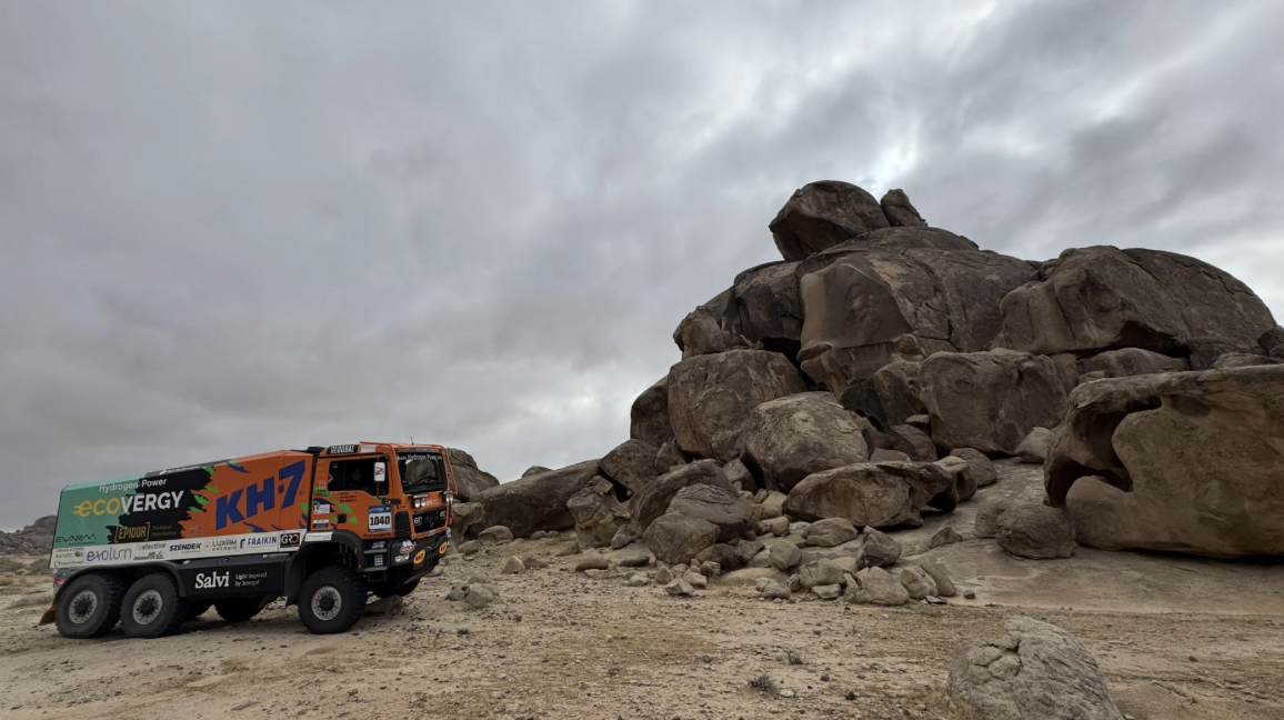Atacando al máximo, el KH-7 ECOVERGY Team también ha podido constatar el buen funcionamiento del sistema híbrido de alimentación de Hidrógeno / HVO. “No nos frena nada, ni las piedras ni la arena. El sistema de hidrógeno ha funcionado a la perfección en todo momento”, confirma el ingeniero Xavi Ribas, tercer tripulante de la cabina y director de EVARM, la compañía española que ha desarrollado esta tecnología pionera, que marcha líder en la categoría de energías alternativas del Dakar.