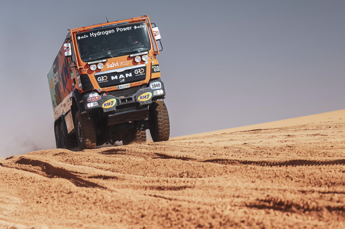 Un día más, el MAN 6×6 y su sistema pionero de alimentación con hidrógeno han rendido a la perfección. El único apuro del equipo ha sido un ruido que los tripulantes han empezado a oír, procedente de la parte delantera. Era debido a la rotura de un soporte de la cabina, fruto de la acumulación de kilómetros sobre el terreno más duro imaginable en el motorsport. No obstante, después de un enlace final de 187 kilómetros, Juvanteny, Criado y Ribas han llegado sin novedad al campamento, donde los mecánicos iban a proceder a cambiar el soporte para continuar mañana.