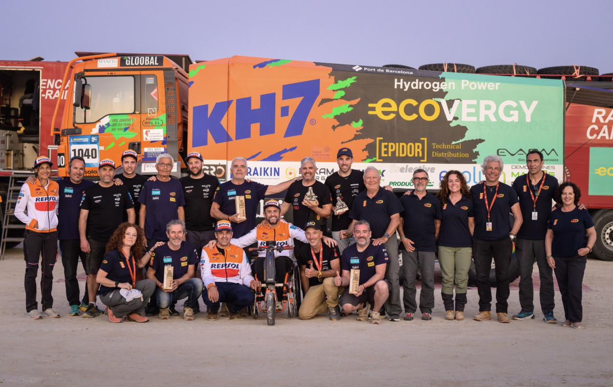 Ahora sí. ¡Misión cumplida en Mission 1000! El KH-7 ECOVERGY Team ha confirmado este viernes un triunfo inapelable en la categoría de vehículos de energías alternativas del Dakar Future. Jordi Juvanteny, José Luis Criado y Xavi Ribas, a los mandos del camión MAN 6×6, alimentado por un sistema mixto de Hidrógeno / HVO (aceite vegetal hidrotratado), han culminado su reto dakariano subiendo a lo más alto del podio de Shubaytah. Es la segunda victoria consecutiva del veterano equipo español con los colores de KH-7, en la categoría que anticipa el futuro rumbo tecnológico de la carrera más dura del motorsport.