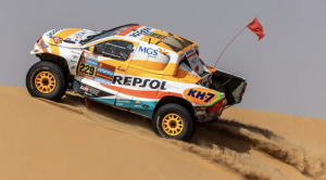 Con Isidre Esteve a los mandos (adaptados en el volante por Guidosimplex) y con Txema Villalobos en su doble papel de navegante y de mecánico a bordo, la competitividad del Toyota Hilux T1+ número 229 también reivindica el trabajo del Technology Lab de Repsol en el desarrollo del combustible, con un 70% de componentes de origen renovable, y del lubricante renovable. El Dakar es un banco de pruebas insustituible para la multienergética española.