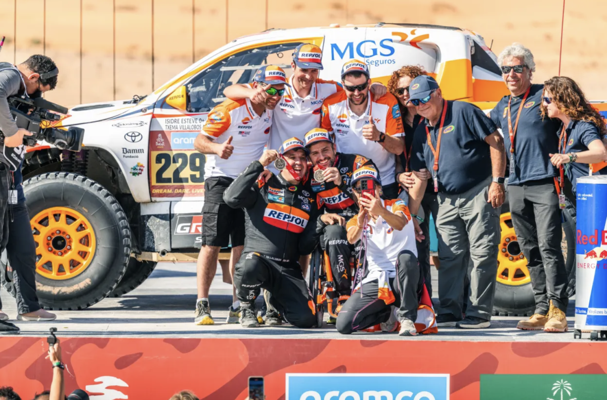 Con Isidre Esteve a los mandos (adaptados en el volante por Guidosimplex) y con Txema Villalobos en su doble papel de navegante y de mecánico a bordo, la competitividad del Toyota Hilux T1+ número 229 también reivindica el trabajo del Technology Lab de Repsol en el desarrollo del combustible, con un 70% de componentes de origen renovable, y del lubricante renovable. El Dakar es un banco de pruebas insustituible para la multienergética española.