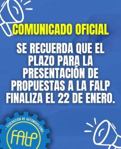 La Federación de Automovilismo de Las Palmas (FALP) recuerda que el 22 de Enero es el último día para presentar propuestas a la FALP. ¡No dejes de pasar la fecha!