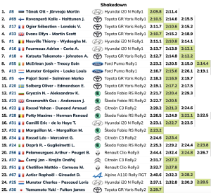 Takamoto Katsuta, de Toyota, completó las seis primeras posiciones, mientras que el nuevo fichaje de Hyundai, Adrien Fourmaux, realizó un alentador inicio en séptima posición. Josh McErlean, de M-Sport Ford, comenzó con cautela su primera participación en un Rally1, pero terminó justo por delante de su compañero de equipo en Puma Grégoire Munster, octavo, mientras que Sami Pajari completó el top 10.