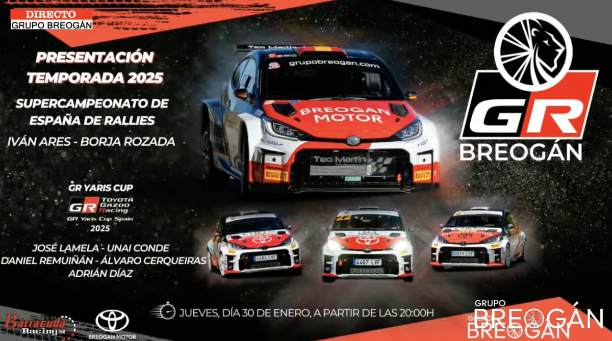Publicamos el vídeo de la presentación de la temporada 2025 del equipo GR Breogán Rally para el Supercampeonato de España de Rallyes con los equipos formados por Iván Ares – Borja Rozada (Toyota GR Yaris Rally2) y los que competirán en la GR Yaris Cup.
