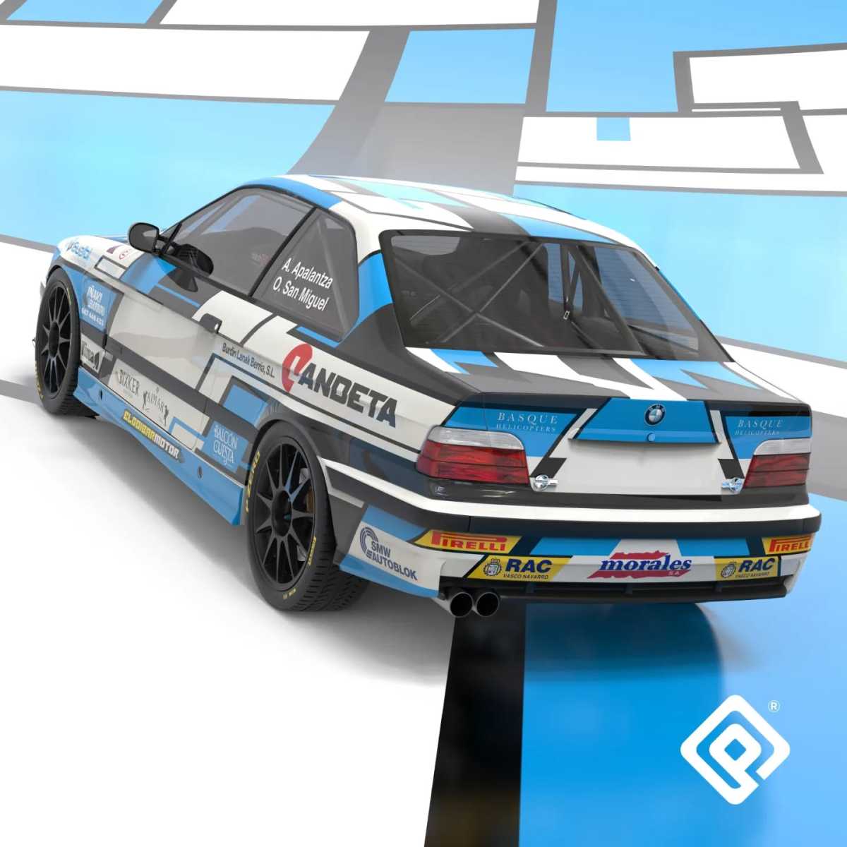 Hemos renovado la imagen del BMW M3 E36 de los actuales campeones del País Vasco de Rallysprint, Aitzol Apalantza y Olatz San Miguel, basándonos en una parte de su diseño del año pasado para aplicarlo por todo el vehículo, jugando con formas geométricas y asimetría en las vistas superiores.