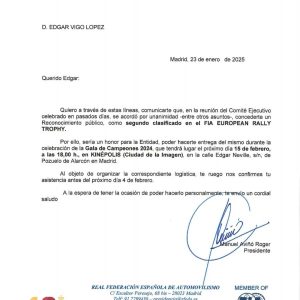 Los gallegos Édgar Vigo y Fátima Ameneiro, subcampeón y campeona de la FIA European Rally Trophy de la temporada 2024, recibieron el reconocimiento por parte del presidente de Real Federación Española de Automovilismo, Manuel Aviñó. En la gala de la Federación Internacional de Automovilismo fueron reconocidos por estos logros.