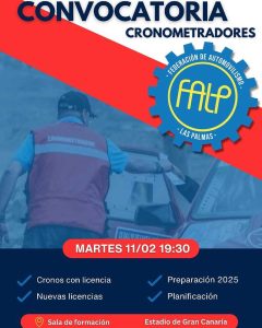 La Federación de Automovilismo de Las Palmas, en su frenético día a día, donde quiere dejar todo atado y bien atado antes del arranque de la presente temporada 2025, mantendrá una reunión con los cronometradores.