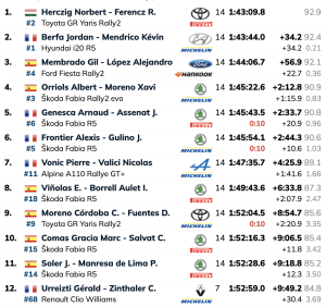 Al final de la etapa, pese al primer scratch con un Rally2 en el asfalto del joven piloto catalán de 17 años Gil Membrado en el último tramo del día, Herczig tenía una ventaja de menos de 20” sobre Jordan Berfa y Kévin Mendrico. Los franceses, con un Hyundai i20 R5, habían comenzado el rally como líderes pero fueron distanciándose poco a poco del húngaro. Hasta ese momento, Gil Membrado y Jandrín López se encontraban en el tercer puesto a la espera de la segunda jornada.