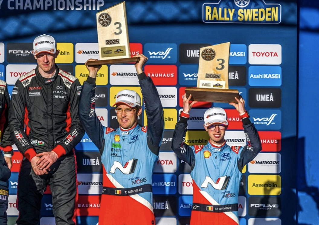 Los belgas Thierry Neuville y Martijn Wydaeghe (Hyundai i20 N Rally1 nº1), campeones del mundo 2024, logran en el Rally de Suecia su primer podio de 2025.