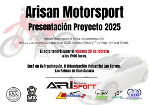 Arisan Motorsport presentará, el próximo viernes 28 de febrero, a las 19:00 horas, sus dos proyectos deportivos para la temporada 2025. La presentación será en C/Arguineguín, 8 Urbanización Industrial Las Torres y estará abierta a todos aquellos aficionados/as que deseen asistir.
