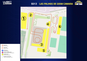 El tramo espectáculo dentro del estadio de baloncesto Gran Canaria Arena será el encargado de cerrar la acción el sábado, 26 de abril. Esta súper especial tiene 1,80 kilómetros y es la decimotercera del rally.