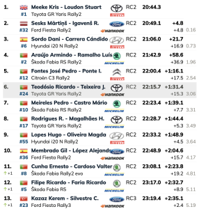 Fuera de los puestos de podio, el primer equipo luso, el compuesto por Armindo Araújo y Luís Ramalho (Škoda Fabia RS Rally2), seguidos de sus compatriotas José Pedro Fontes e Inês Ponte (Citroën C3 Rally2).