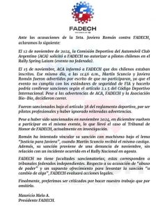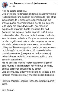 La copiloto chilena Javiera Román, que ha competido en varios países de sudamérica como Perú, Chile o Argentina, logrando destacados resultados y varios podios de clase y absolutos, además de varias participaciones en citas del WRC, ha recibido una sanción deportiva por parte de la Federación de Automovilismo Deportivo de Chile de seis meses.