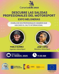 El mundo del MotorSport ofrece cada vez más salidas profesionales y la FCA quiere divulgar esas posibilidades en una nueva edición de Canarias Skills, que se desarrolla el miércoles 12 y el jueves 13 de marzo en Expomeloneras. Para ello contará con dos jóvenes canarios exponentes de esta especialidad, José López y Pablo Suárez, que han hecho carrera en la alta competición del motor.