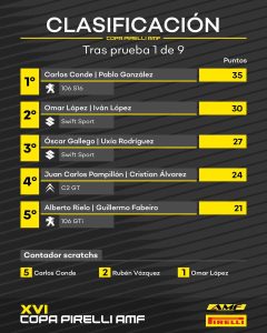 Lejos de amilanarse, Carlos Conde se recompuso para endosar una diferencia importante a López en la segunda pasada por Saborida y asegurar así su primer triunfo en este certamen, acompañado de Pablo González. Omar López, igualmente contento sobre un Suzuki Swift que en estas condiciones era bastante competitivo, firmaba la segunda plaza precediendo a la otra montura nipona, la de Óscar Gallego. Pampillón terminaba cuarto, sumando buenos puntos a la espera de acceder a los podios en próximas citas.