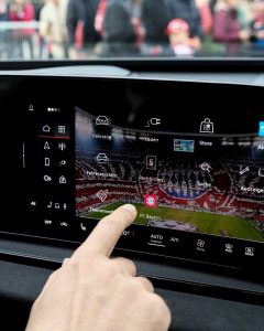Audi lleva su especial relación con el deporte al siguiente nivel al convertirse en el primer fabricante de automóviles en integrar la amplia oferta del servicio de streaming deportivo DAZN en sus vehículos. Esto permitirá a los aficionados al deporte disfrutar de eventos deportivos en directo, momentos destacados y documentales desde el asiento del conductor en la pantalla de 36,7 cm (14,5 pulgadas) del MMI touch display, por ejemplo, durante una pausa para recargar su vehículo. La integración de la aplicación también permite a los pasajeros seguir todo el contenido en la pantalla del acompañante MMI passenger display incluso cuando el coche está en movimiento: utilizando aplicaciones de terceros, el pasajero delantero puede visualizar eventos deportivos en directo, películas o series y acceder a juegos en la pantalla de 27,7 cm (10,9 pulgadas) sin distraer al conductor, gracias a un filtro de seguridad que integra la pantalla.